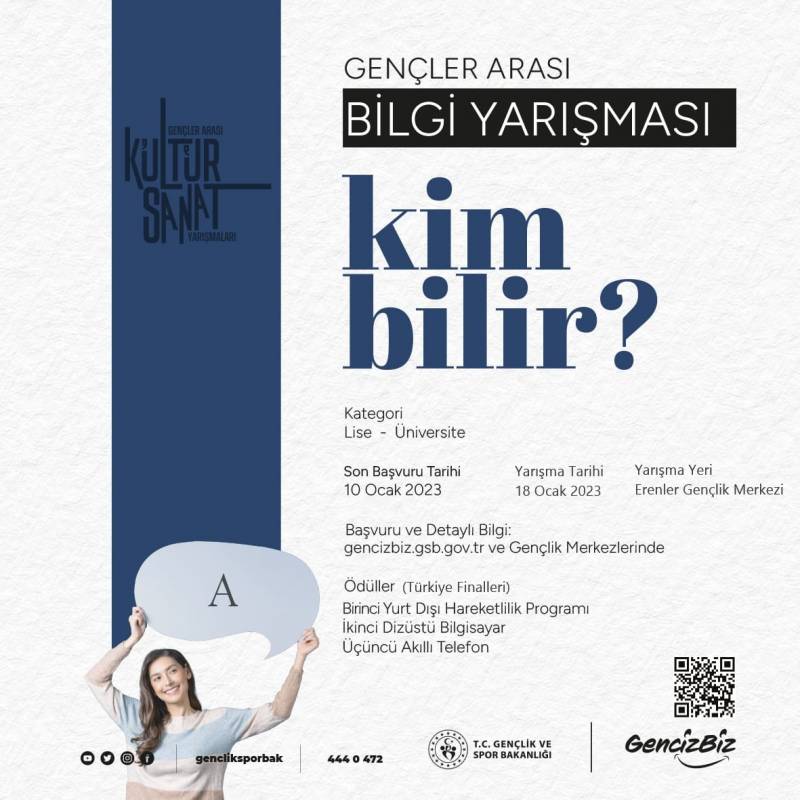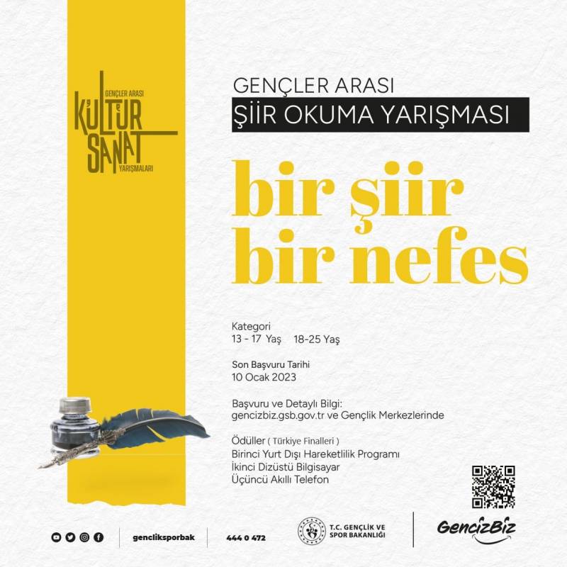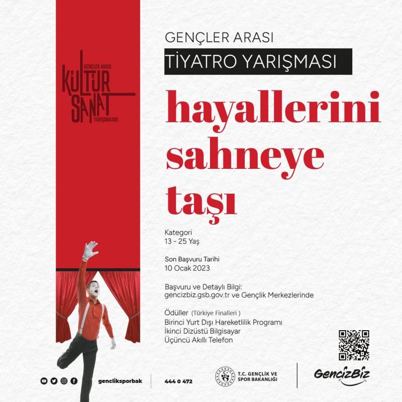 Gençlik ve Spor Bakanlığınca gençlerimizin geleneksel sanatımıza sahip çıkan, okuyan, düşünen, araştıran ve uygulayan bireyler olarak yetişmesi amacıyla "Gençler Arası Kültür ve Sanat Yarışmaları" başlığı altında Ses ve İcra, Tiyatro, Şiir Okuma ve Bilgi yarışmaları düzenlenecektir. Yarışmalara dair afişler ekte yer almaktadır.